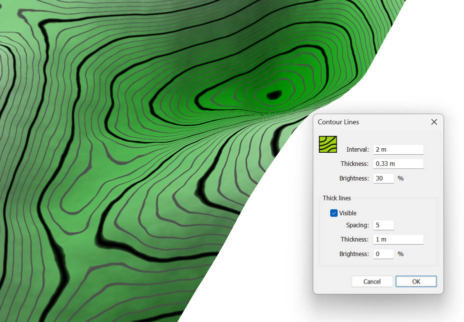 Keep track of terrain elevations easily with contour lines that redraw in realtime, as you edit. Place elevation labels where you want.